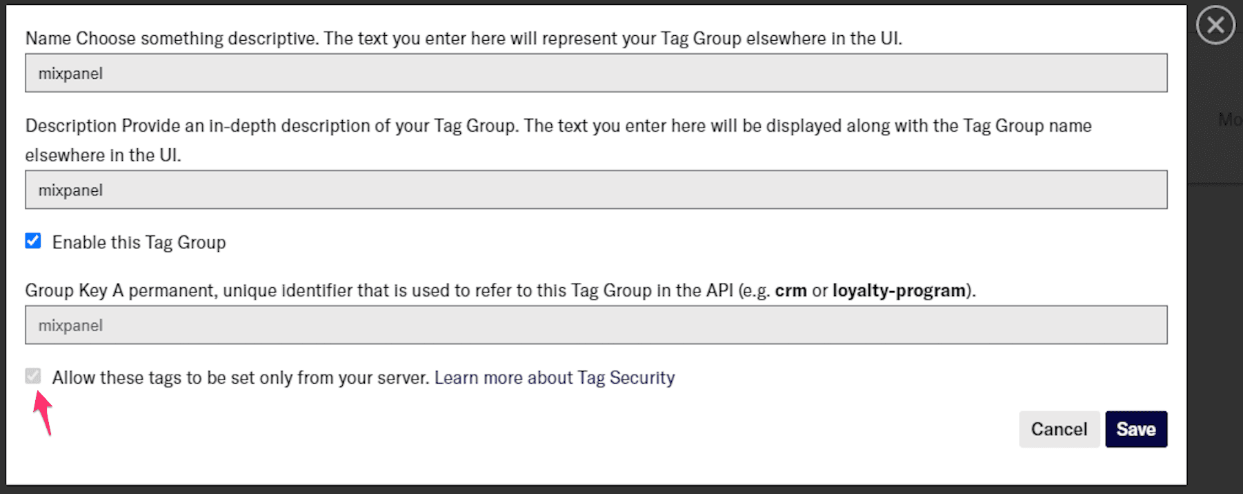 If the setting below is enabled in Airship, you will see the error “Master secret required to set tags on Tag Group mixpanel” in Mixpanel. Work with Airship to disable this setting so Mixpanel can update the Airship tag group.
