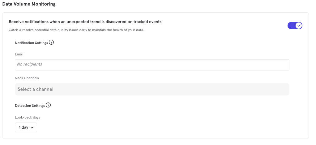 When enabling this setting, input email addresses or aliases to be notified when a spike or drop is detected. This will be gated to project admin and owner email addresses. Admins can also set up a Slack channel to be notified when a spike or drop is detected.